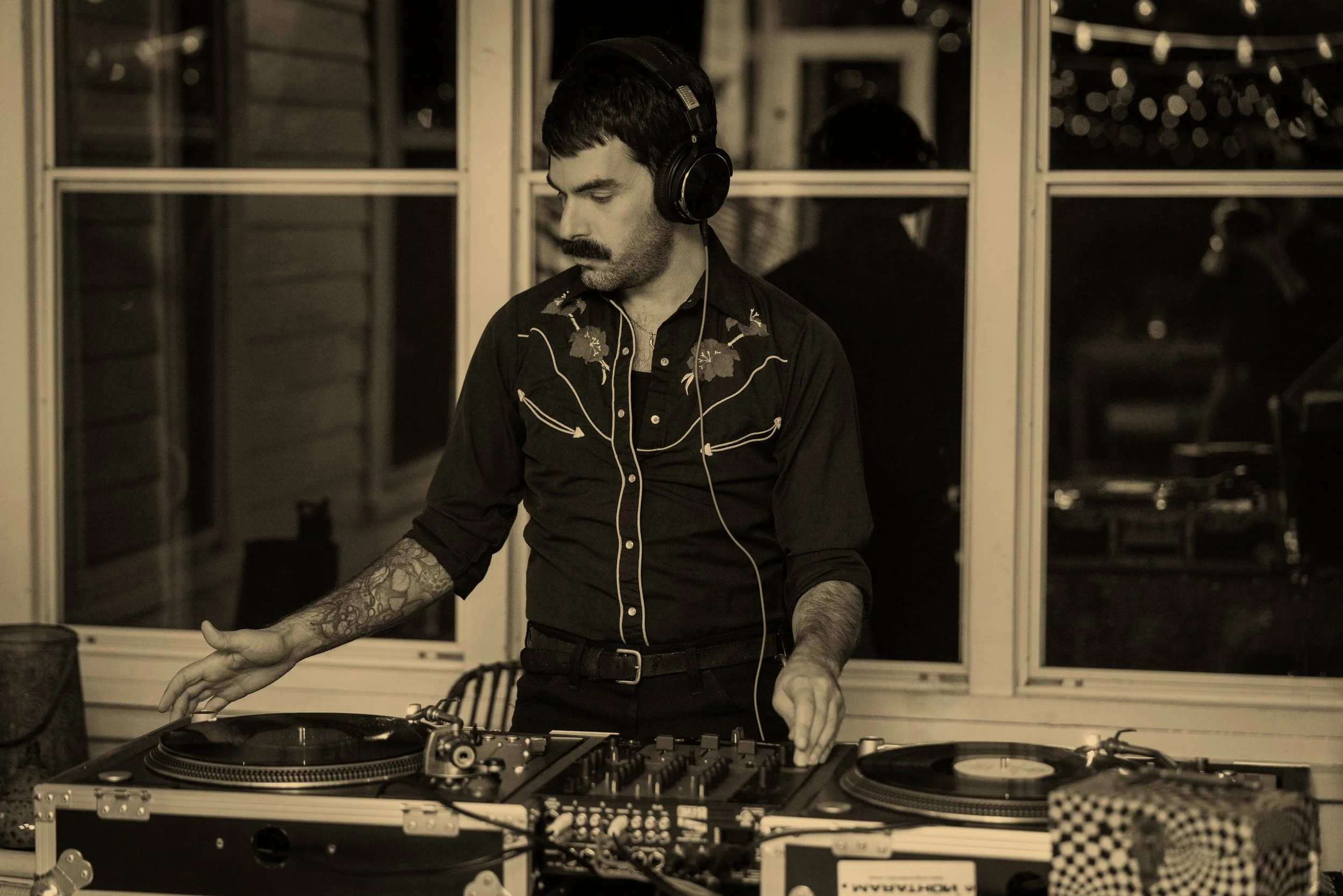 • A DJ with headphones playing vinyl records on turntables at an event, with a crowd in the background and a basket of records on a nearby table. The scene is in sepia tone.